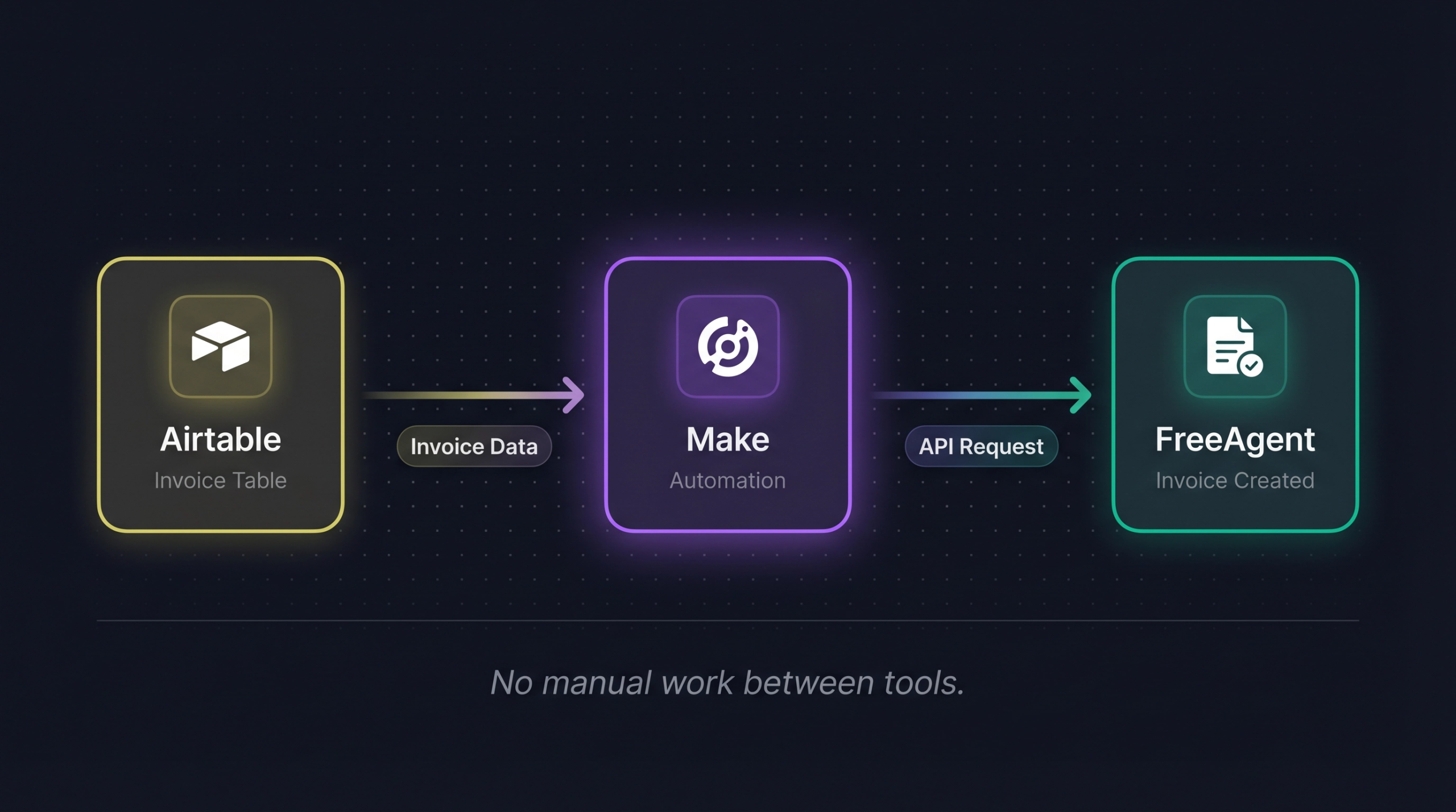 Here’s a concrete example from my own work. I have an invoicing table in Airtable where I collate all the information I need for an invoice. Rather than going into FreeAgent and manually creating that invoice, I have an automation in Make that takes the invoice data from Airtable and communicates with the FreeAgent API to create the invoice automatically. That eliminates any manual work between those two tools.